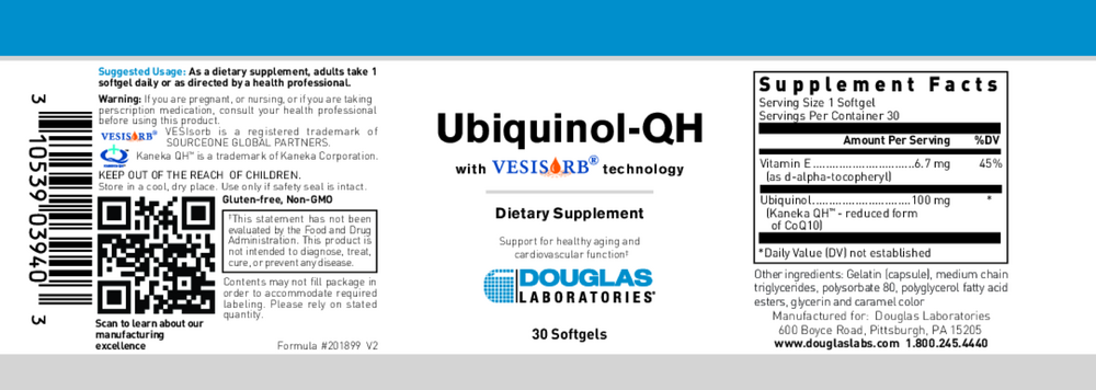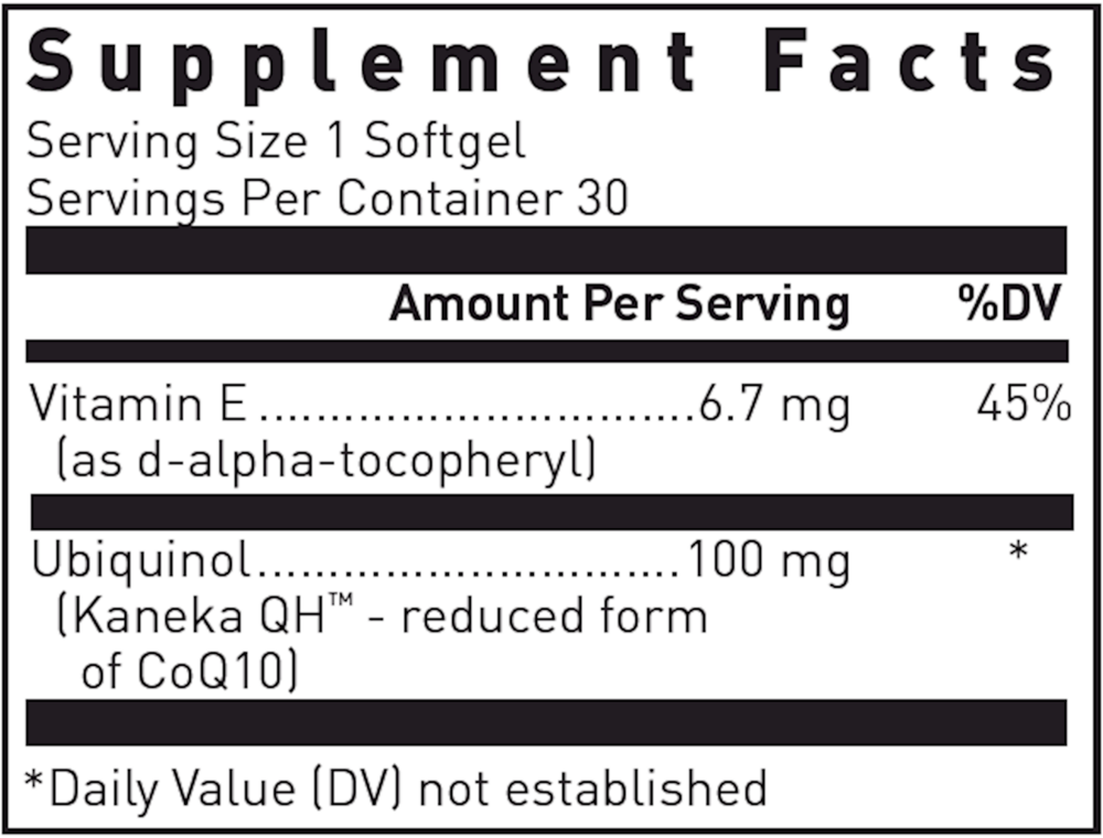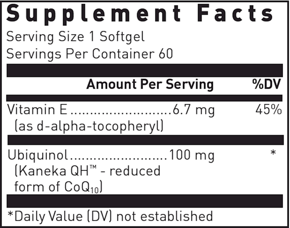 Ubiquinol with VESISORB® Technology for enhanced absorptionUbiquinol-QH is a softgel containing 100 mg of natural ubiquinol in a patented, naturally self-assembling nano-colloid system called VESIsorb® technology for enhanced absorption. Ubiquinol is the biologically reduced form of ubiquinone, also known as coenzyme Q10. Ubiquinol may be of special importance for older adults looking to support healthy aging and cardiovascular function.*