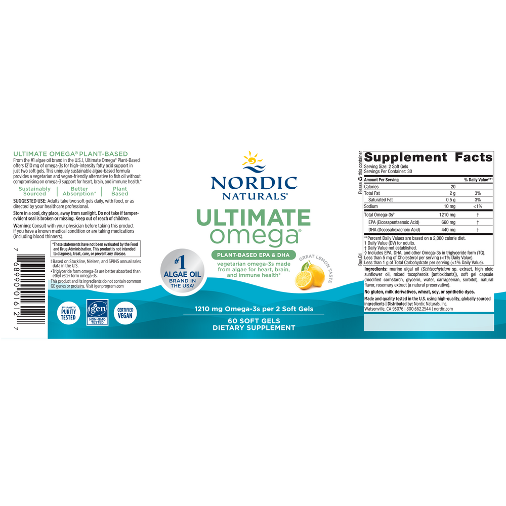 Ultimate Omega Plant-Based offers 1210 mg of omega-3s for high-intensity fatty acid support in just two soft gels.* This uniquely sustainable algae-based formula provides a vegetarian and vegan-friendly alternative to fish oil without compromising on omega-3 support for heart, brain, and immune health.* Sustainably sourced, better absorption, and plant-based.*