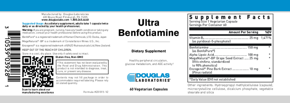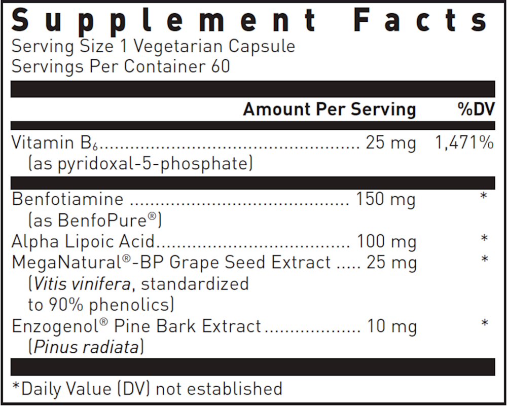 Ultra Benfotiamine contains the fat-soluble thiamine vitamin called benfotiamine, plus activated vitamin B6, alpha lipoic acid, grape seed extract and pine bark extract to support healthy peripheral neuronal function, circulation and kidney function. Research suggests that benfotiamine helps to moderate AGE (advanced glycation end product) formation, a process related to glucose metabolism.*