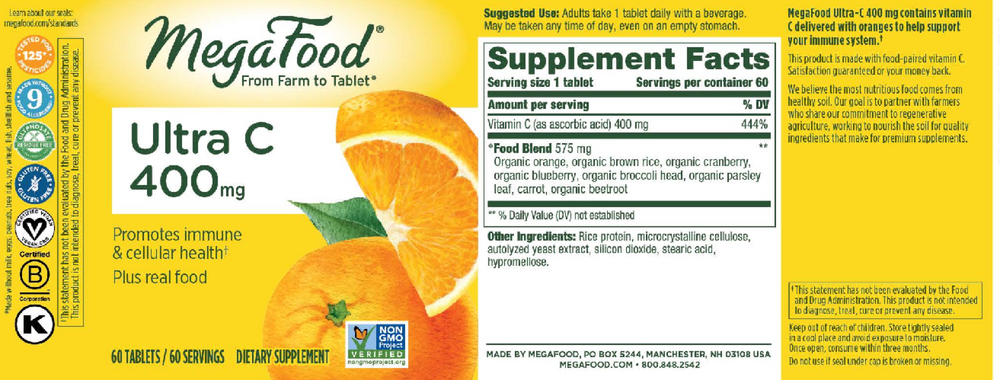 Megafood Ultra-C 400 provides antioxidant Vitamin C delivered with real organic oranges for the ultimate immune- support.* You’ll also find Nourishing Food and Herb Blend for an added spectrum of phytonutrients.*