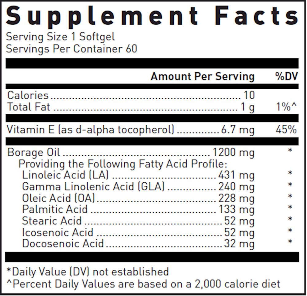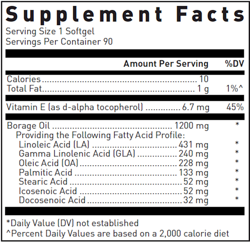 Ultra G.L.A. supplies the important gamma linolenic acid (GLA), providing 240 mg of GLA per softgel. Ultra G.L.A. softgels are manufactured using only 100% vegetable oil from borage seeds (Borago officinalis), with 10 IUs of natural vitamin E for antioxidant protection. The oil is cold-processed and handled carefully to avoid any oxidation.