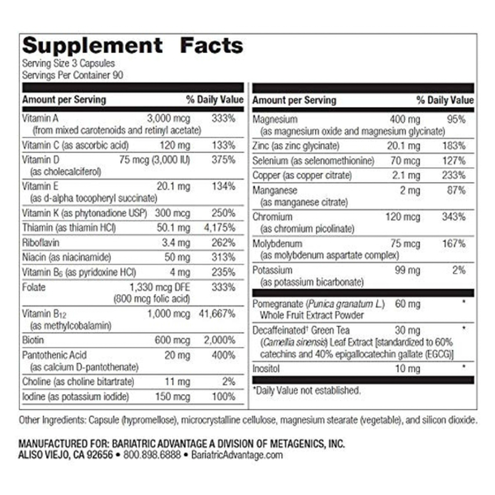 Bariatric Advantage Ultra Multi is our highest potency multi with each 3 capsule serving delivering at least 200% DV of 13 key nutrients including vitamins A, B1 (thiamin), B12 (cobalamin), D3, K, and (iron optional) along with at least 100% DV of 9 other essential nutrients.