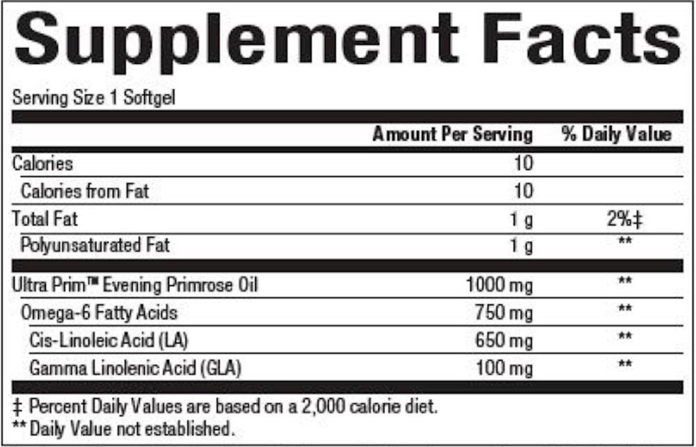 Ultra Prim is made from the highest quality evening primrose oil, a natural source of the omega-6 essential fatty acid gamma-linolenic acid (GLA). GLA is a fatty acid that is important for healthy inflammatory response, immune response, and promotes women’s health by providing nutritional support for PMS.* The oil is extracted by cold pressing, also called expeller pressing. This gentle method crushes the seed to release its nutritional oil, without the application of external heat or harsh solvents such as hexane. Cold pressing enhances stability and helps preserve the nutritional components of the oil. Ultra Prim is also ultra-purified to remove any organic residues or impurities, giving you a stable product without preservatives.