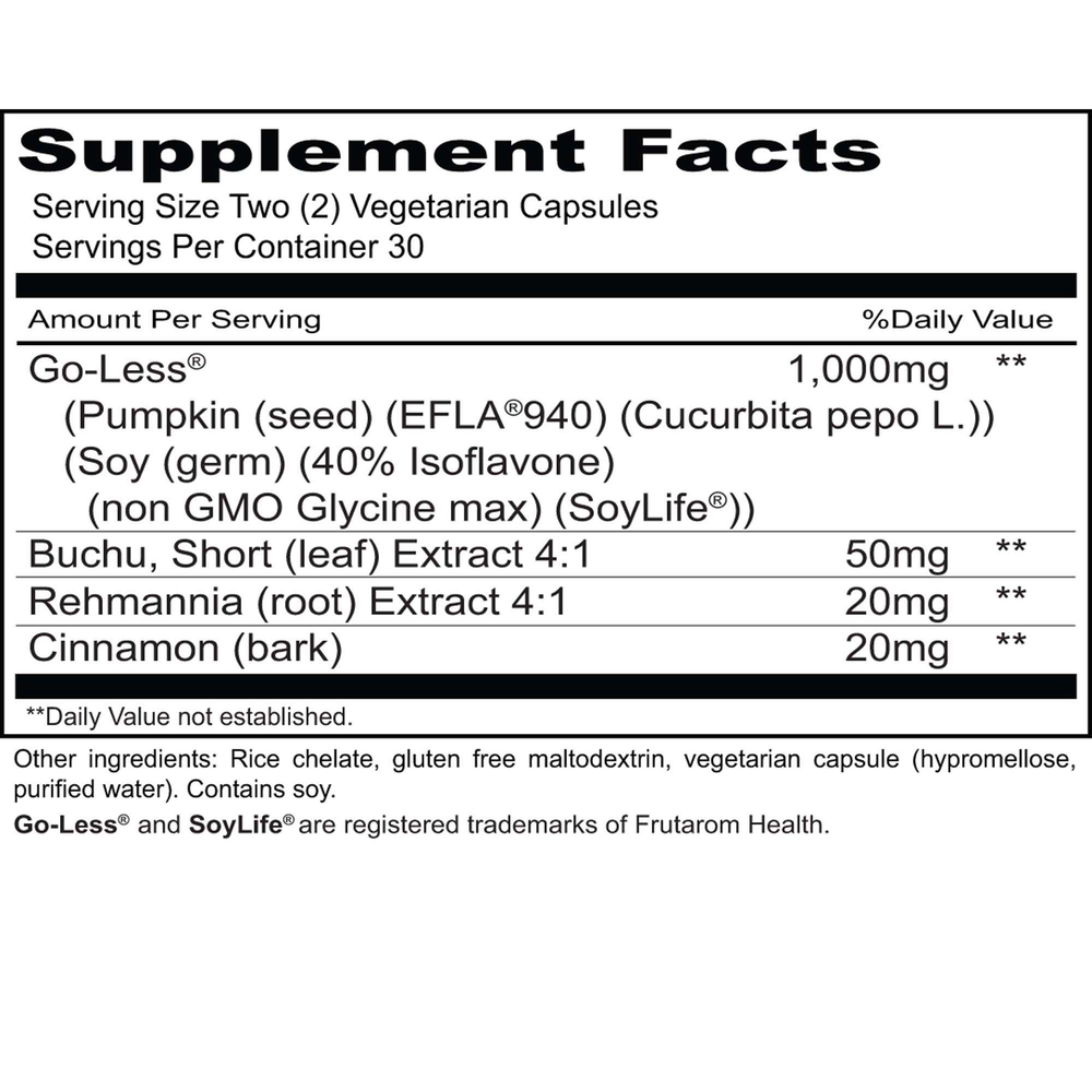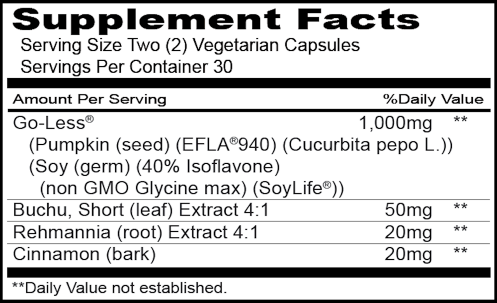 Urgent-Less is designed to support healthy bladder function. It is built around the patented ingredient Go-Less. Go-Less® from Frutarom is a combination of two natural ingredients, pumpkin seed (EFLA 940®) and nonGMO SoyLife®, soy germ 40% isoflavone. Urgent-Less also provides the proprietary supportive ingredients buchu leaf, rehmannia root and cinnamon bark.
