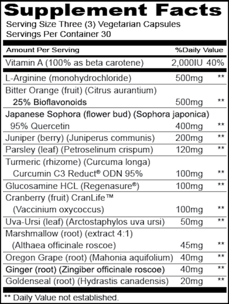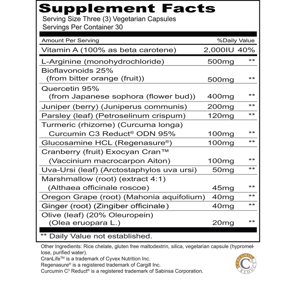 This special formulation supplies the immune system support of Oregon grape, ginger and goldenseal. It also includes elements to soothe and comfort the complete urinary system.*CranLife is a 100% cranberry extract providing 1.2 mg/g of anthocyanins and 30% natural cranberry fiber.* L-Arginine promotes healthy nitrous oxide levels. Nitrous oxide is a substance that relaxes smooth muscles like those found in the bladder.* The beneficial qualities of bioflavonoids are provided in a clinical dose of both citrus bioflavonoids and a potent standardized extract of quercetin. The bioflavonoid curcumin is included as Curcumin C3 Reduct® a patented extract of 95% tetrahydrocurcumin a form of curcumin with superior bioavailability.*