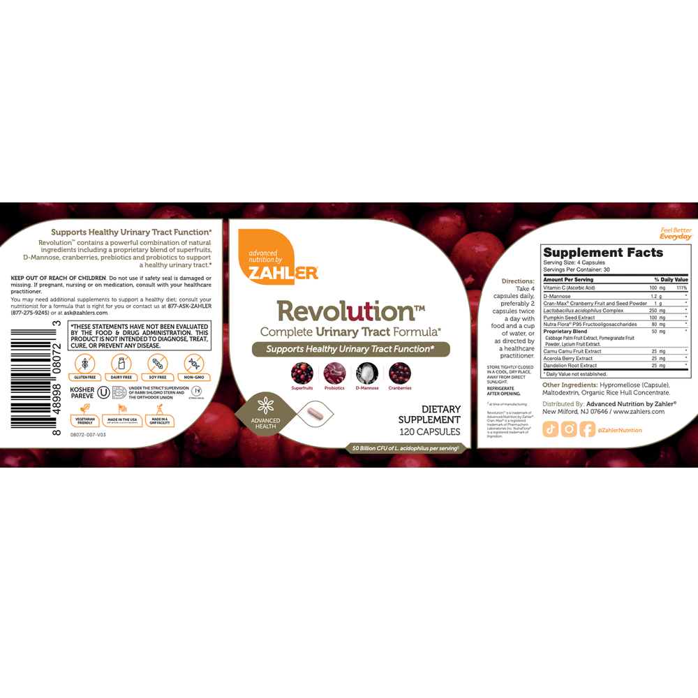 UT Revolution is a brilliant urinary tract formula which contains a potent blend of ingredients, such as Superfruits, D-Mannose, Cranberries, Probiotics and more, to support a healthy urinary tract and bladder health. One of the main featured ingredients in UT Revolution is D-Mannose‚ a type of sugar which has the helpful ability of supporting the healthy environment of the urinary tract. Other helpful ingredients included in this formula are Cran-Max Cranberry Extract‚ FOS (NutraFlora) and Vitamin C‚ all of which support healthy urinary tract function.