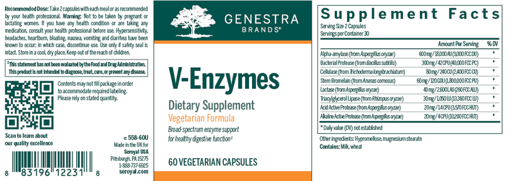 V-Enzymes is a benchmark vegan digestive support product. The formula helps to reduce the complex nutritional components of food, digesting proteins, lipids and complex carbohydrates to allow for optimal absorption. In laboratory results, the effects of one V-Enzymes capsule on digestion of beef, egg white and zucchini was investigated (items provided a typical profile of protein, fat and carbohydrate). The in vitro experiments simulated intestinal conditions including adjustments for pH and simulated ‘churning and pulverization’ action of the stomach (via stomacher mixed well and incubated at 37°C/ 98.6°F). In all cases the addition of V-Enzymes completely liquefied the food item compared to the control where only stomach pulverization took place.*