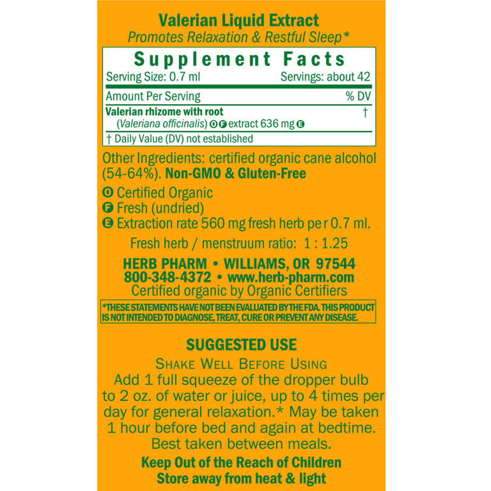 Herb Pharm prepares Valerian extract from the fresh (never dried) root and rhizome of Certified Organic Valeriana officinalis plants. The rhizome & root are harvested in autumn and are then promptly extracted while still fresh and succulent.
