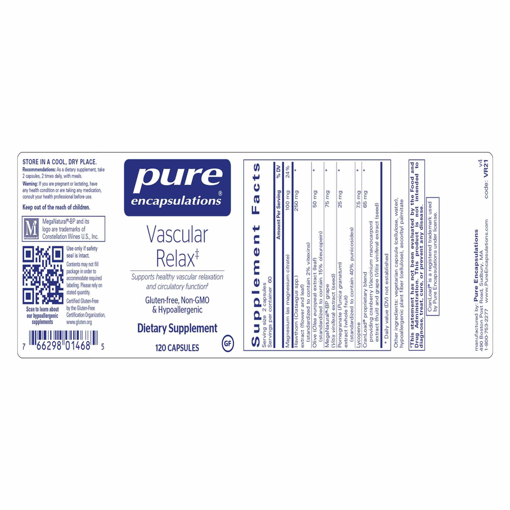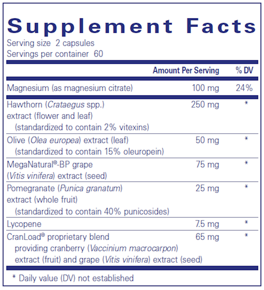 Magnesium supports healthy cellular electrolyte function and vascular smooth muscle cells. The importance of magnesium intake was demonstrated in the 10-year follow-up of the Women’s Health Study, where higher intakes of dietary magnesium were associated with maintaining healthy vascular relaxation. Both hawthorn and olive leaf have a long history of traditional use for maintaining cardiovascular health and have supported vascular function in studies. Patent- pending MegaNatural®-BP supports healthy blood vessel relaxation. MegaNatural®-BP grape seed is unique in that the extraction process maximizes the concentration of monomeric and oligomeric procyanidins and minimizes the concentration of polymeric procyanidins. Pomegranate, standardized to contain 40% punicosides, offers the antioxidant and vascular benefits associated with pomegranate juice.