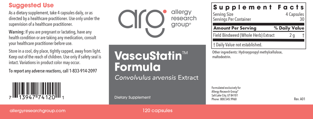 VascuStatin Formula is a water extraction of the leaves of the herb Convolvulus arvensis, commonly known as bindweed, which contains proteoglycan mixture (PGM). The bindweed contained in VascuStatin is grown in Wyoming, and the toxic alkaloids are removed by a proprietary process.