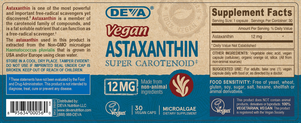 Deva™ Vegan Astaxanthin is 100% animal free. All Deva Products are 100% vegan, vegetarian and are registered by the Vegan Society, the non-profit organization that actually invented the word "vegan".