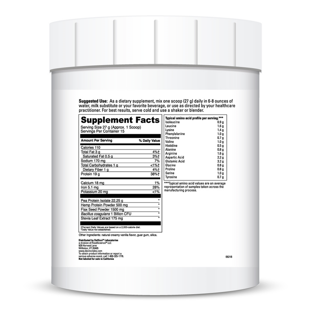 Vegan Protein is comprised of a natural Pea Protein Isolate lending a high level of nourishment along with clinical functionality for a broad range of applications. The blend of Flax and Hemp lend to the high degree of bioavailability inherent to this formula. This great tasting protein powder is rounded out with a stable probiotic to aid in digestive support.*
