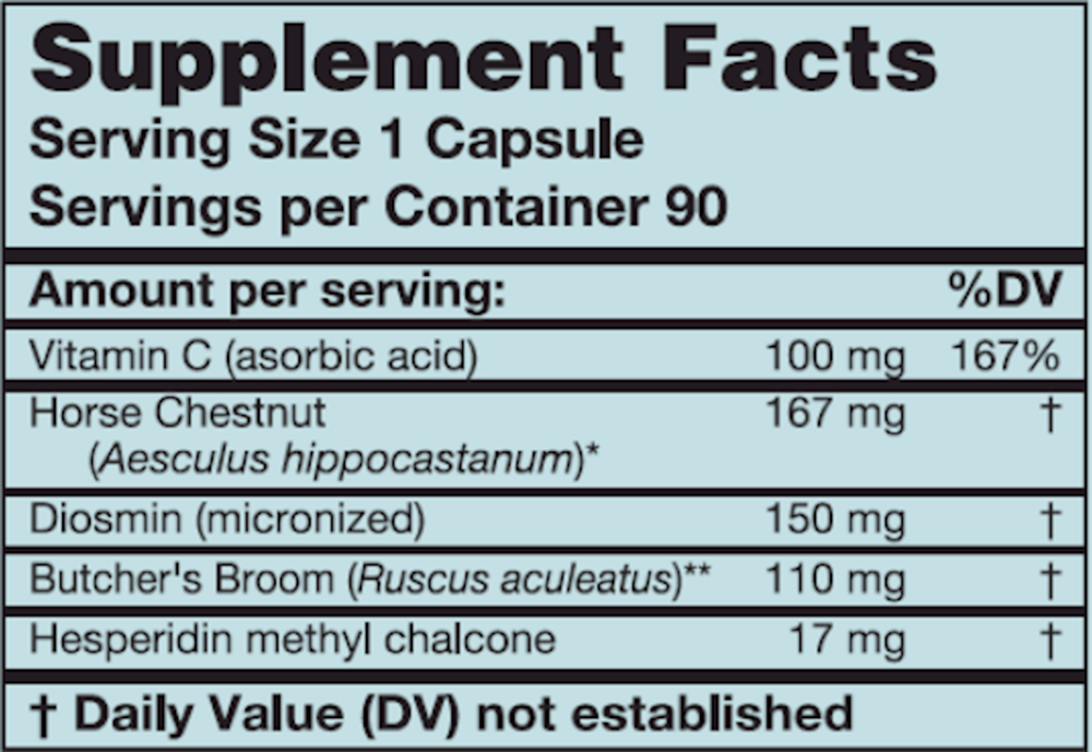 Venous Support contains clinically-studied botanical and flavonoid combinations to support the connective tissue integrity of veins and capillaries. Optimal function of the venous circulatory system is essential for controlling fluid balance within the tissues of the upper and lower extremities, and to maintain normal volume of the leg and hemorrhoidal veins. Horse Chestnut Seed Extract contains escin, and Butcher's Broom contains ruscogenins; these saponins are responsible for effects on vascular tone and permeability. The flavonoids diosmin and hesperidin, often combined with vitamin C, also have important influences on vascular connective tissue.*
