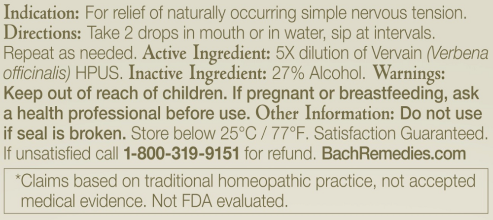 Active ingredients (5X HPUS): Vervain (Verbena officinalis). Inactive ingredients: 27% grape alcohol solution.