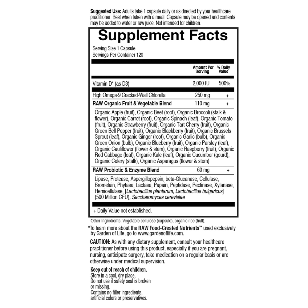 Vitamin Code RAW D3—RAW whole food vitamin D3 delivered in a whole food lipid base of cracked-wall chlorella to support absorption* and blended in a base of 23 fruits and vegetables with live probiotics and enzymes.
