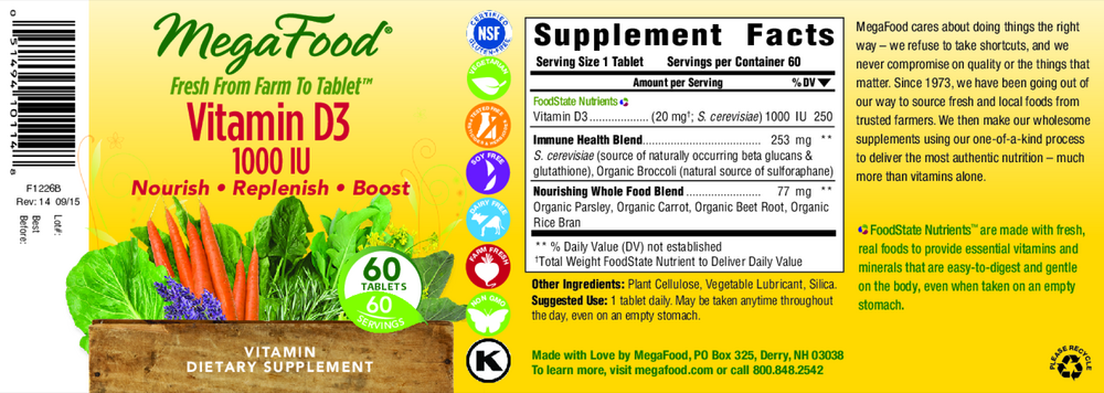 Vitamin D3 is a powerhouse vitamin that aids in healthy bones, hormones' and immune function*, and maintaining optimal levels can contribute to an overall sense of wellbeing*. MegaFood® Vitamin D3 1000 IU (25 mcg) is delivered with real, whole foods that provide synergistic cofactors.