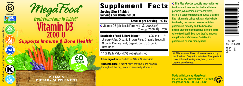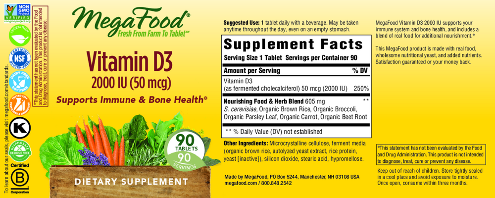 Vitamin D3 is a powerhouse that aids in healthy bones, hormones and immune function, and maintaining optimal levels can contribute to an overall sense of wellbeing (more ‘Om,’ less ‘Um?’).* MegaFood® Vitamin D3 2000 IU (50 mcg) is delivered with organic whole foods that provide synergistic cofactors.* Megafood's D3 supplement can be taken at any time of the day, even on an empty stomach.