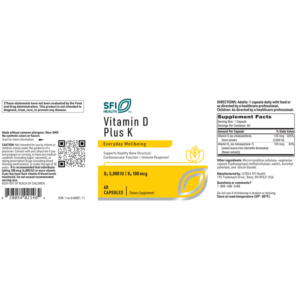 Vitamin D and K are structurally similar fat-soluble vitamins. Synergistically, they support healthy calcium metabolism and bone mineralization throughout the body as well as a healthy calcium balance in vascular tissues.* Recent studies have shown that vitamins D and K support healthy functioning of both innate and adaptive immune response.* Klaire’s Vitamin D Plus K is a bioavailable combination of 5,000 IU of Vitamin D3 (cholecalciferol) and 100 mcg Vitamin K2 (menaquinone-7, MK7).
