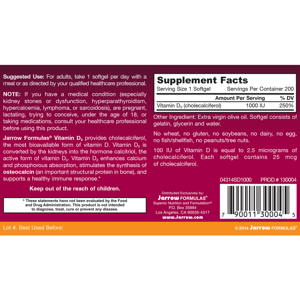 Jarrow Formulas® Vitamin D3 provides cholecalciferol, the most bioavailable form of vitamin D. Vitamin D3 is converted by the kidneys into the hormone calcitriol, the active form of vitamin D3. Vitamin D3 enhances calcium and phosphorous absorption, stimulates the synthesis of osteocalcin (an important structural protein in bone), and supports a healthy immune response.*