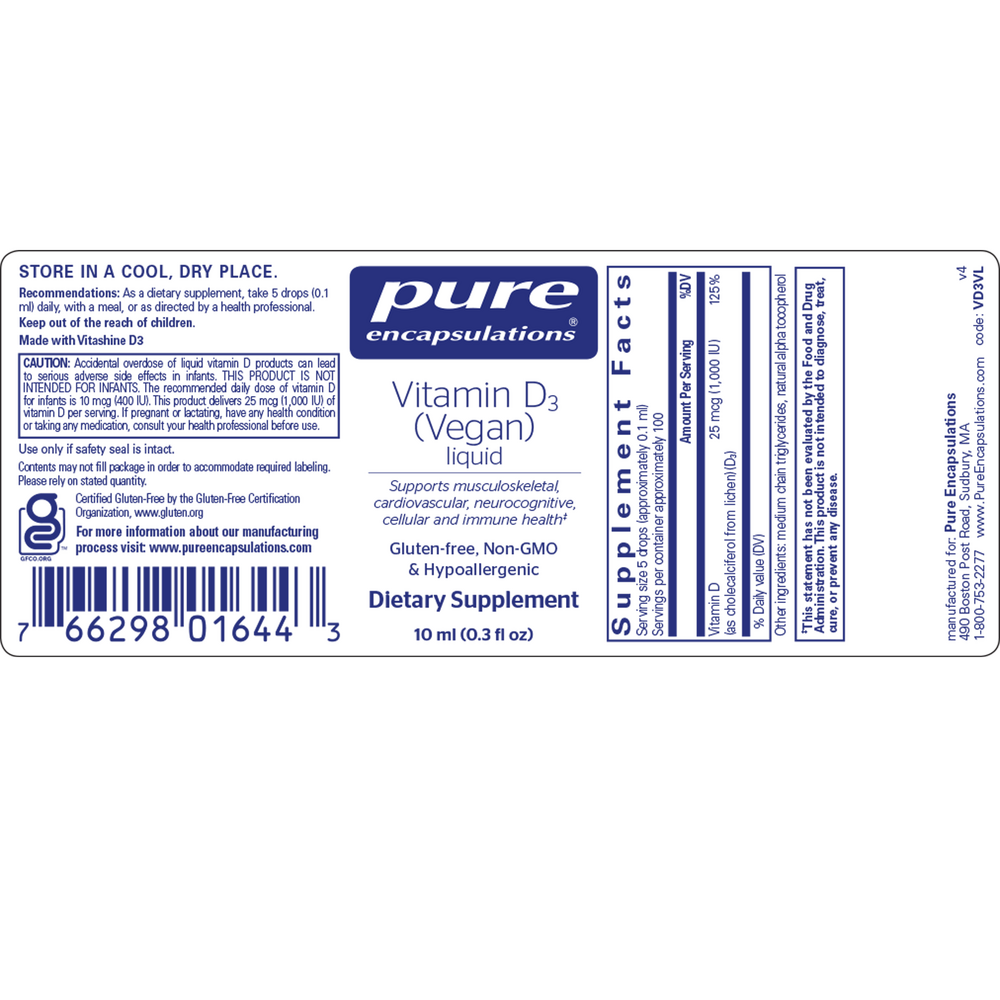 Pure Encapsulations' Vitamin D3 (Vegan) liquid is derived from naturally occurring, sustainably harvested lichen. It is produced through a multistep process involving the extraction, purification, and concentration resulting in a vitamin D3 cholecalciferol with the same molecular structure and conformation as cholecalciferol derived from lanolin or fish. It is the only plant-derived source of vitamin D3 that has been accepted by the UK Vegan Society.*