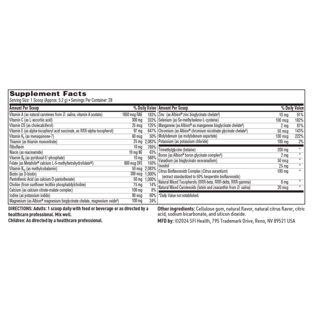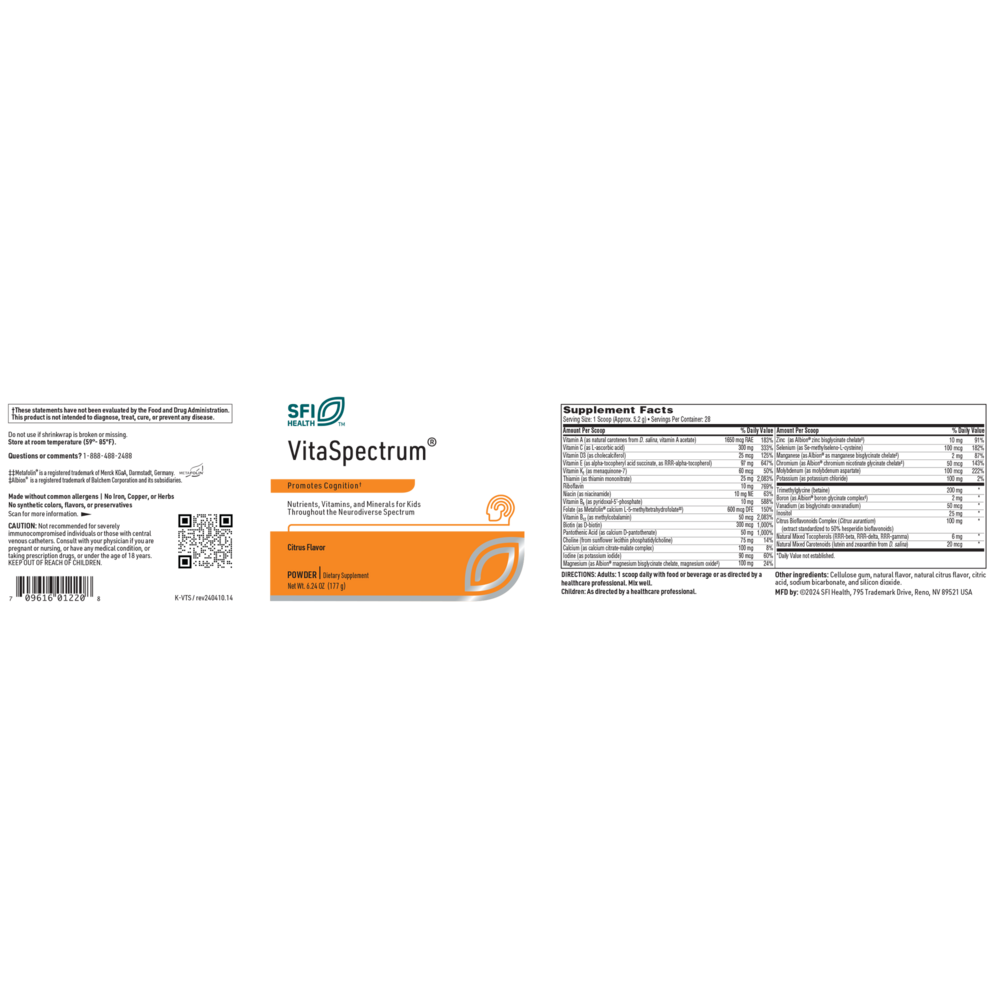 VitaSpectrum® addresses these inadequacies by supplying balanced amounts of vitamins, minerals, and trace elements in forms that are typically well tolerated by those on the spectrum. Bioactive forms of folate, B12, and B6 are included along with naturally sourced carotenes, vitamin E, and D for optimal nutrient absorption and utilization. Iron and copper, often contraindicated in those on the spectrum, are excluded. VitaSpectrum® is free of common allergens, including milk/casein, eggs, fish, shellfish, tree nuts, peanuts, and wheat/ gluten. No starch, maltodextrin, stearates, artificial sweeteners, colors, flavors, or preservatives are used. VitaSpectrum® formulas comply with Gluten-Free/Casein-Free (GFCF) diets. For maximum tolerance and versatility as a foundational nutritional program, herbal ingredients are avoided. The pleasant, natural berry-pomegranate or citrus flavored powder formulas dissolve easily in liquids or can be mixed in foods. A convenient measuring scoop is provided for accurate measurement.