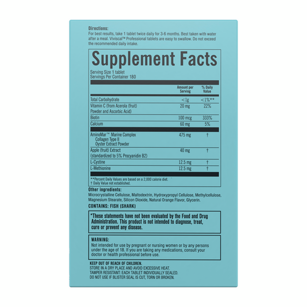 Viviscal Professional dietary supplements are scientifically formulated with the ground-breaking, exclusive marine complex AminoMar®, which helps to nourish thinning hair from within and promote existing hair growth. Along with AminoMar, Viviscal Professional hair growth supplements also contain key nutrients essential for healthy hair growth, including Biotin, Apple Extract and Vitamin C.* Viviscal Professional is suitable for women and men of all hair types.*