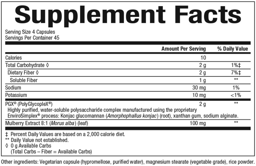 The combination of PGX® and mulberry extract helps lower the glycemic index of your meals, slow glucose absorption and promote healthy blood sugar levels already in normal range.* Incorporating PGX® into your daily diet will help promote satiety, curb food cravings and normalize appetite and metabolism.*