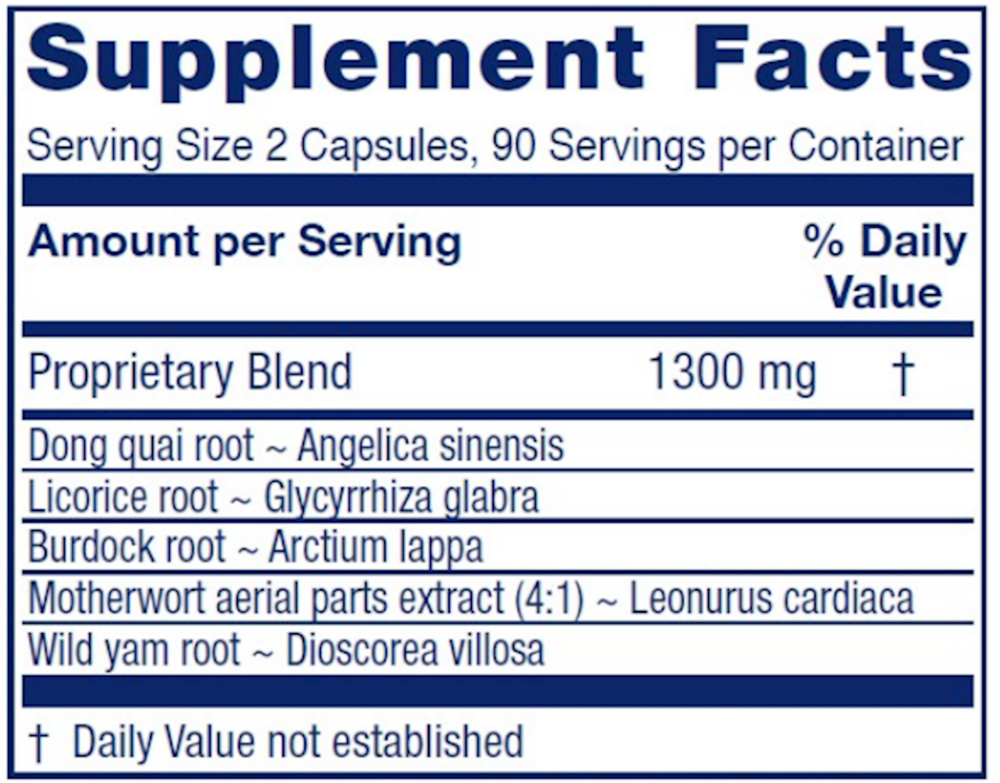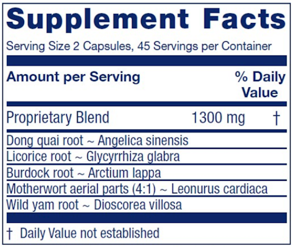 • Phytoestrogenic support for menopause and maintenance support for healthy breasts, bone and heart tissues from Licorice root, Dong quai and Wild yam*