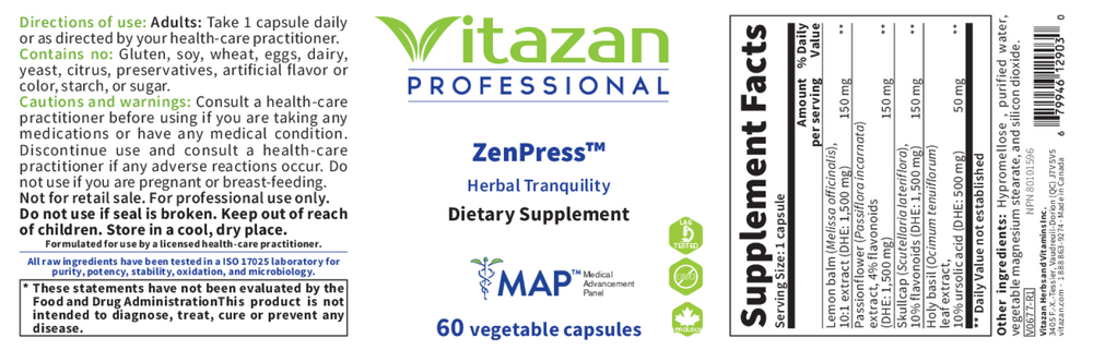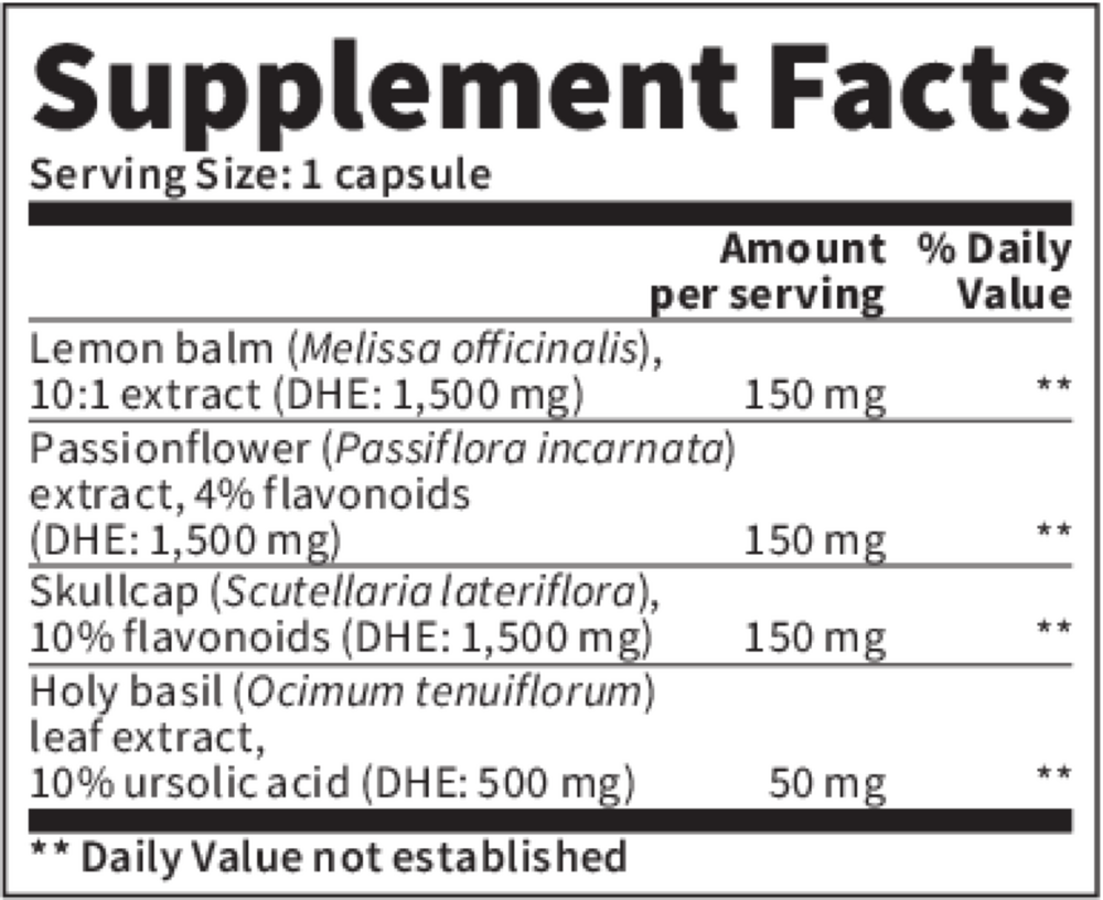 Ingredient Quantity Holy Basil 45 mg Ursolic Acid 5 mg Lemon Balm 150 mg Passionflower Extract 144 mg flavonoids 21 mg Scutellaria lateriflora extract 135 mg Other Ingredients: Hypromellose, purified water, vegetable magnesium stearate, and silicon dioxide.Serving size: 1 Capsule