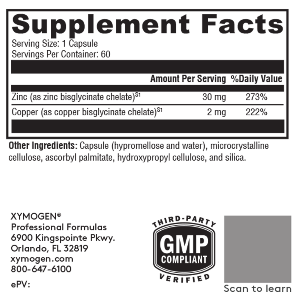 Zinc + Copper provides highly absorbable forms of these essential trace minerals, which are crucial for the activity of numerous enzyme systems.* Zinc is vital for a healthy immune response and plays a key role in reproductive health.* Copper is a necessary cofactor for cellular energy metabolism, red blood cell formation, and catalyzing oxidation-reduction reactions.* A balanced intake of these 2 minerals is important, as copper depletion can occur with increased zinc intake.*