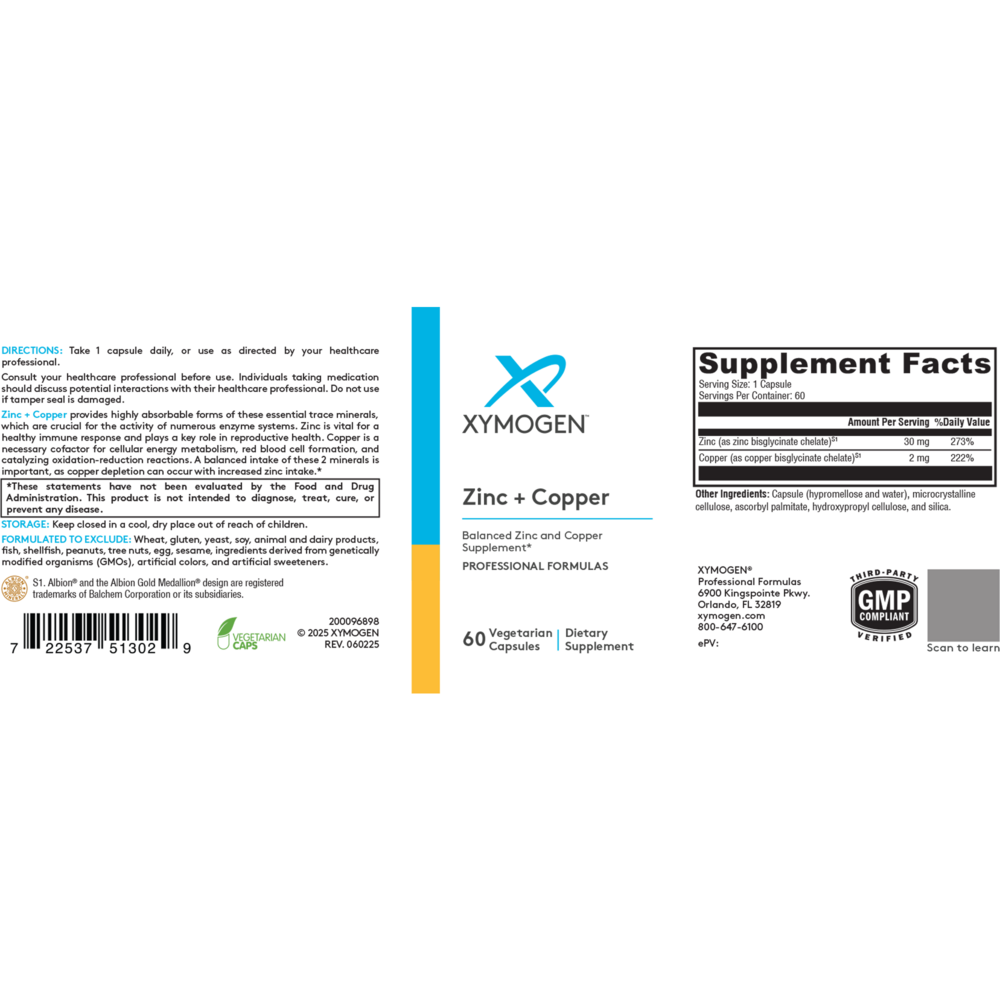 Zinc + Copper provides highly absorbable forms of these essential trace minerals, which are crucial for the activity of numerous enzyme systems.* Zinc is vital for a healthy immune response and plays a key role in reproductive health.* Copper is a necessary cofactor for cellular energy metabolism, red blood cell formation, and catalyzing oxidation-reduction reactions.* A balanced intake of these 2 minerals is important, as copper depletion can occur with increased zinc intake.*
