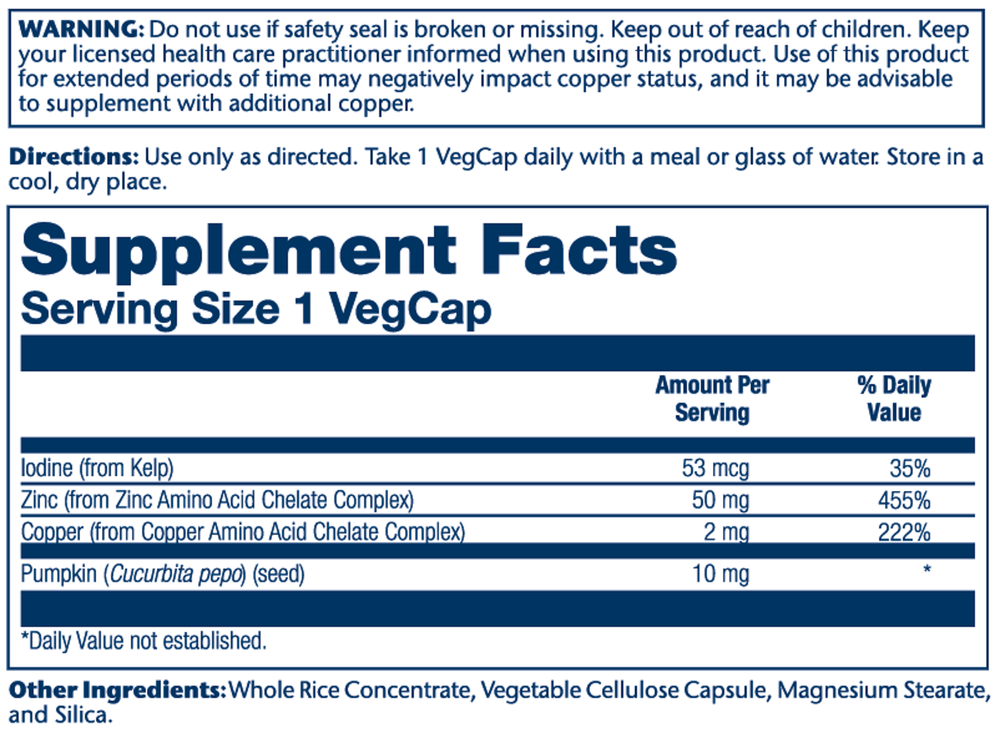 Zinc and copper share similar functions in the body and are necessary for the development of the enzyme superoxide dismutase (S.O.D.), an important antioxidant. A proper zinc to copper ratio may help support healthy cellular and circulatory health. The minerals in this product are reacted with aspartic acid, whole rice concentrate, citric acid and glycine to create a more absorbable chelated complex.