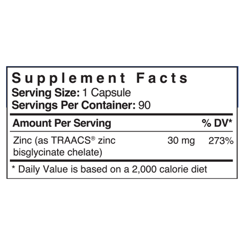 Because zinc is ionized in the gut prior to absorption, Patient One supplies 30mg of zinc as Zinc Bisglycinate, a totally reacted, nutritionally functional zinc amino acid chelate. In this proprietary TRAACS® formulation, zinc is coupled with two glycine molecules to facilitate its absorption across the intestinal wall and reduce interference from phytates and competing minerals. This form has been shown to be readily absorbed by the body.